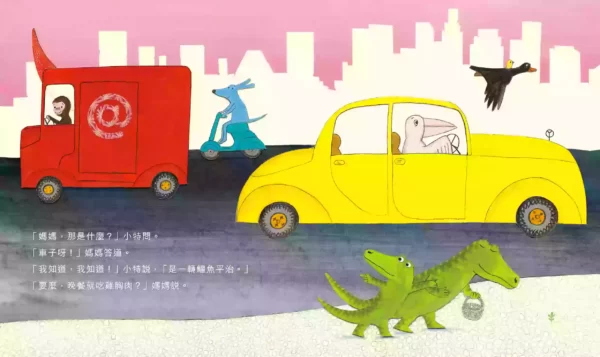 鱷魚媽媽帶著鱷魚小特去買東西。小特一路東張西望:「媽媽,那是什麼?」