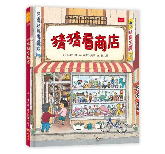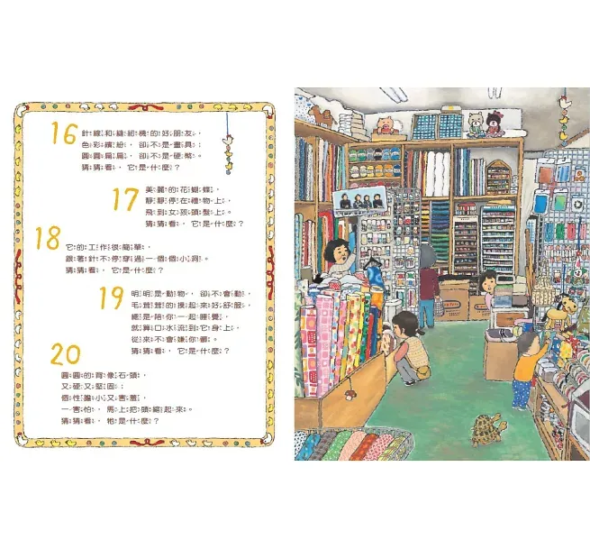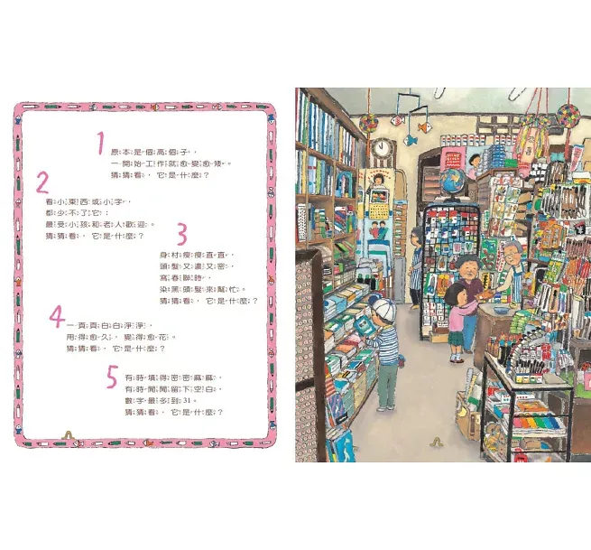 小女孩和奶奶出門買東西,從玩具店、文具店、服飾店、鐘錶行、布行、蔬果行、書店、蛋糕店、藥房到花店,每到一間店都有五則趣味謎題,可以一邊玩猜謎遊戲,一邊從右邊的圖畫中找出答案。