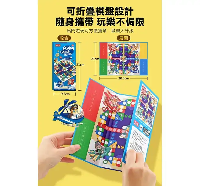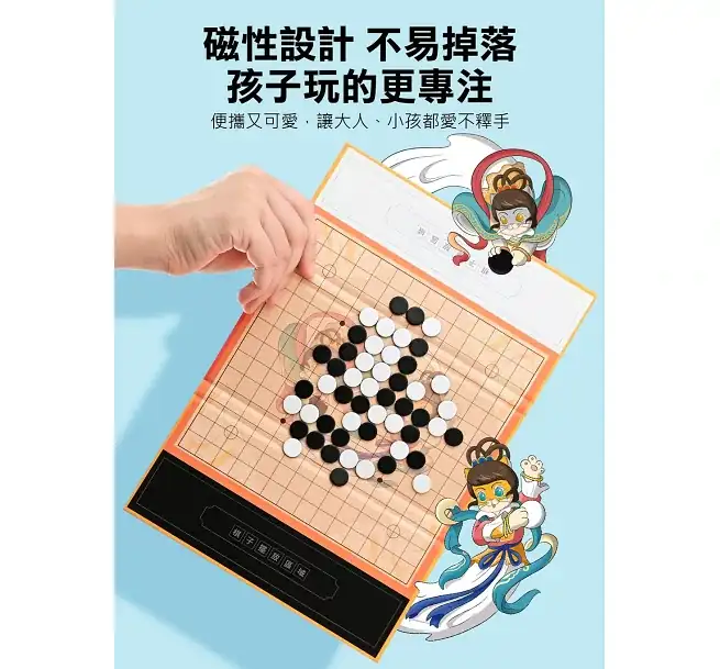 本產品帶有磁性,可以攤開三摺的摺疊棋盤,並使用內附的棋子,即可直接在上面玩!